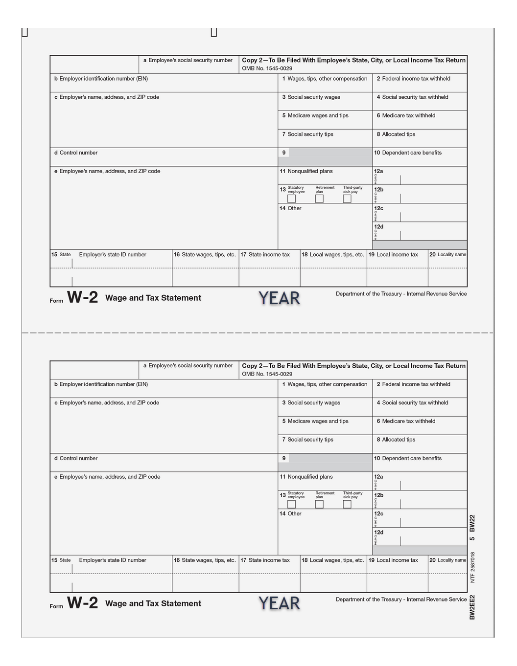 W-2 – Wage & Tax Statement. Use W-2 Copy 2 to print wage and withholding information for employee submission with state or local return. This form is preprinted with black ink. W-2 Forms are 2-up on a sheet with no side perforation. Prints 2 employees per page. Split and collate and insert in compatible envelopes. Order by number of forms, not sheets.